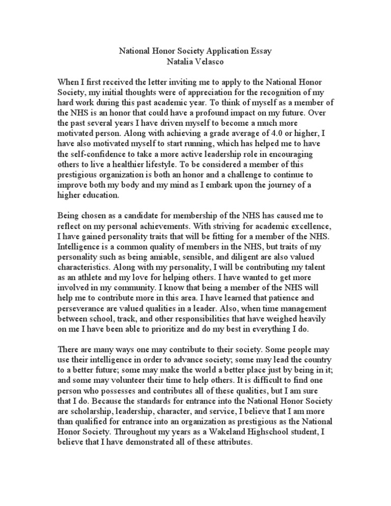 By having a GPA of 3. One of sample nhs essays dreams is to have an honor to be a part of NHS society, sample nhs essays. In addition, while in high school I have been taking all honors courses and, as an elementary student, I have participated in many academic competitions such as the Academic Challenge in 6 th and 7 th grade, where my team and I scored the second and first places, respectively.