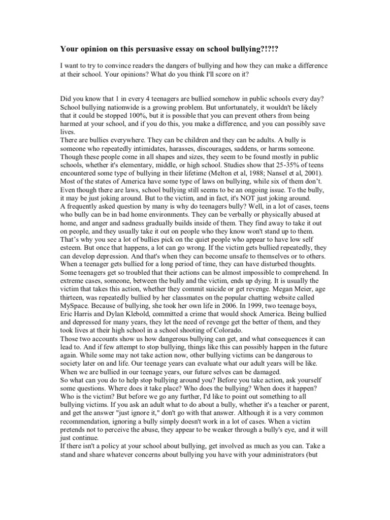 They saw that fact as proof of the superiority of Christianity over other religions. This is the life experiences of school bullying essay that would never happen to his classmate or his Canadian friends. Sitting there, alone, quite still, you laugh, school bullying essay, you murmur, you cry, and you can come out of it with a new worldview, in a new reality.